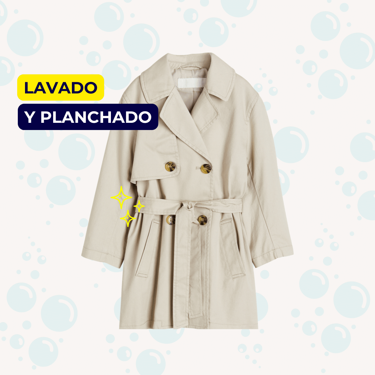 Servicio a domicilio gratuito. Predesmanchado, lavado, secado y planchado de una gabardina.