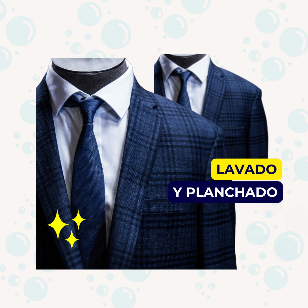 Servicio a domicilio gratuito. Predesmanchado, lavado, secado y planchado de 2 trajes de caballero (chaqueta y pantalón).