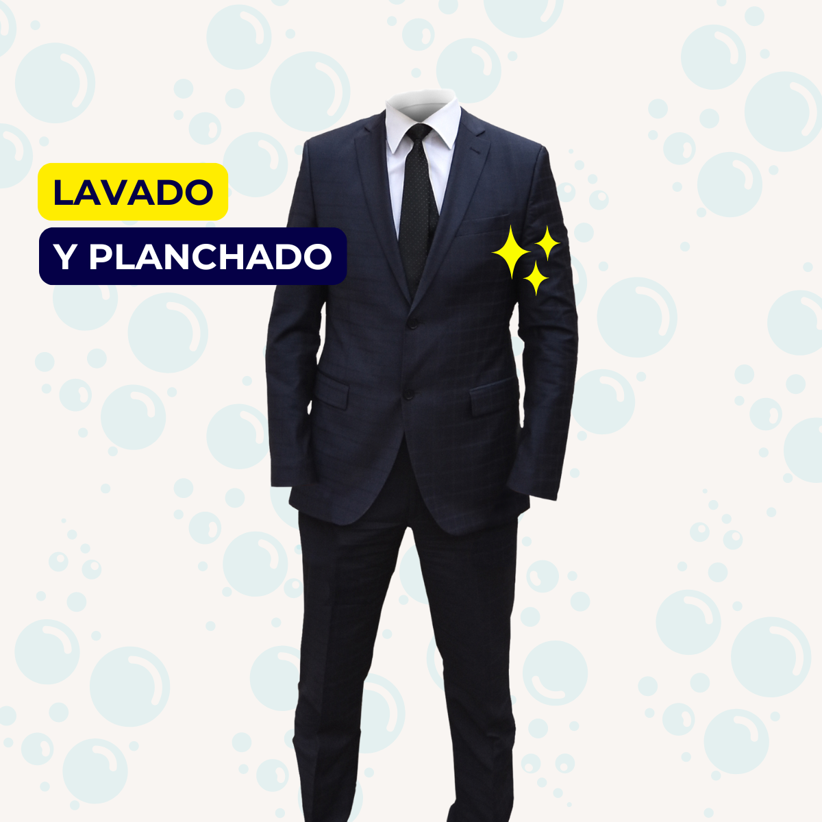 Servicio a domicilio gratuito. Predesmanchado, lavado, secado y planchado de un traje de caballero (chaqueta y pantalón).