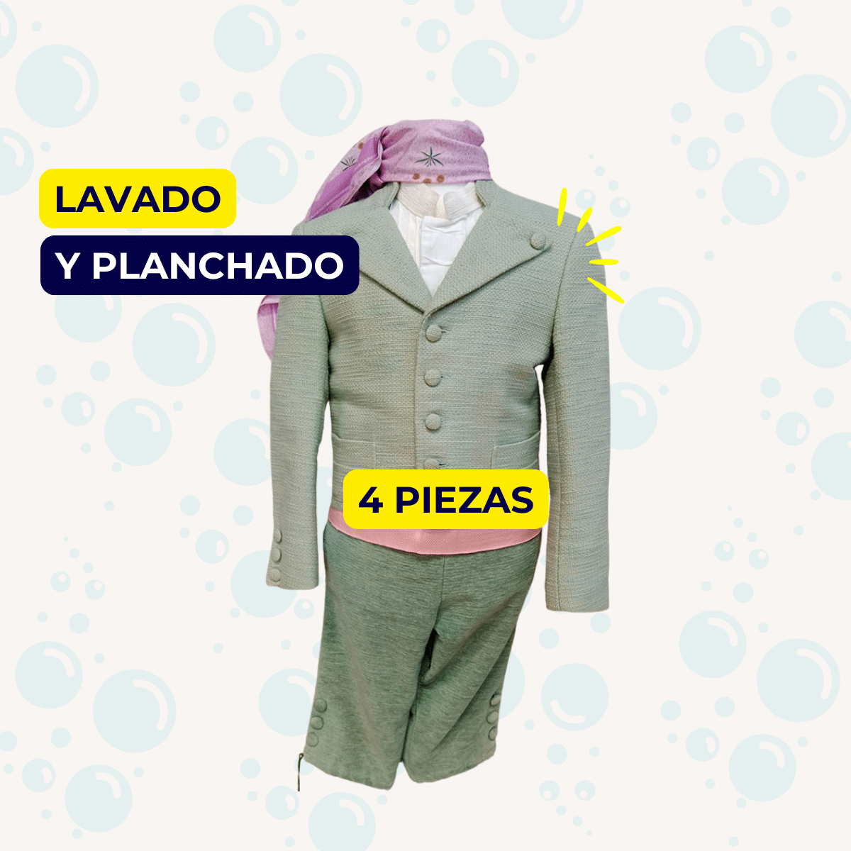 Predesmanchado, lavado, secado y planchado de un traje de fallero adulto. El precio incluye 4 piezas: chaqueta, pantalón, chaleco y blusa.